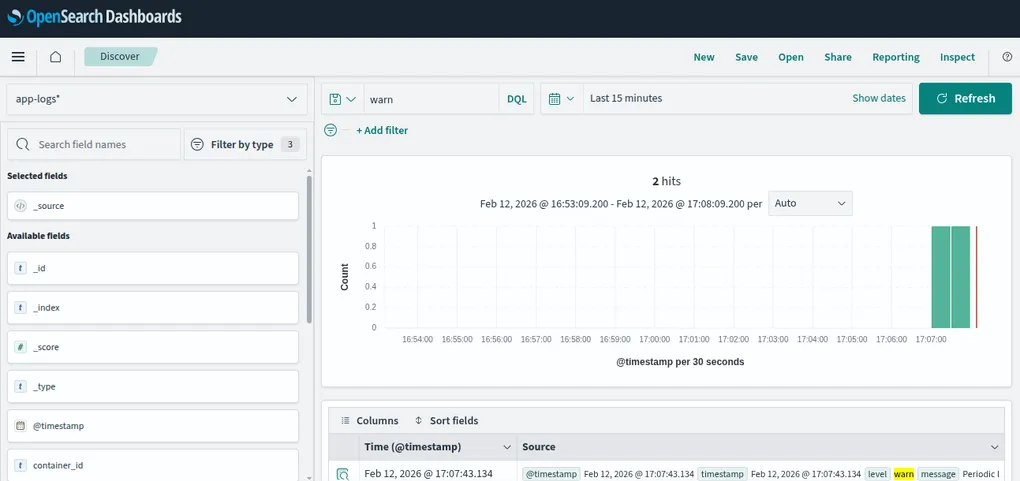 Note that every log is a JSON object with at minimum timestamp, level and message. This makes downstream filtering in OpenSearch trivial.